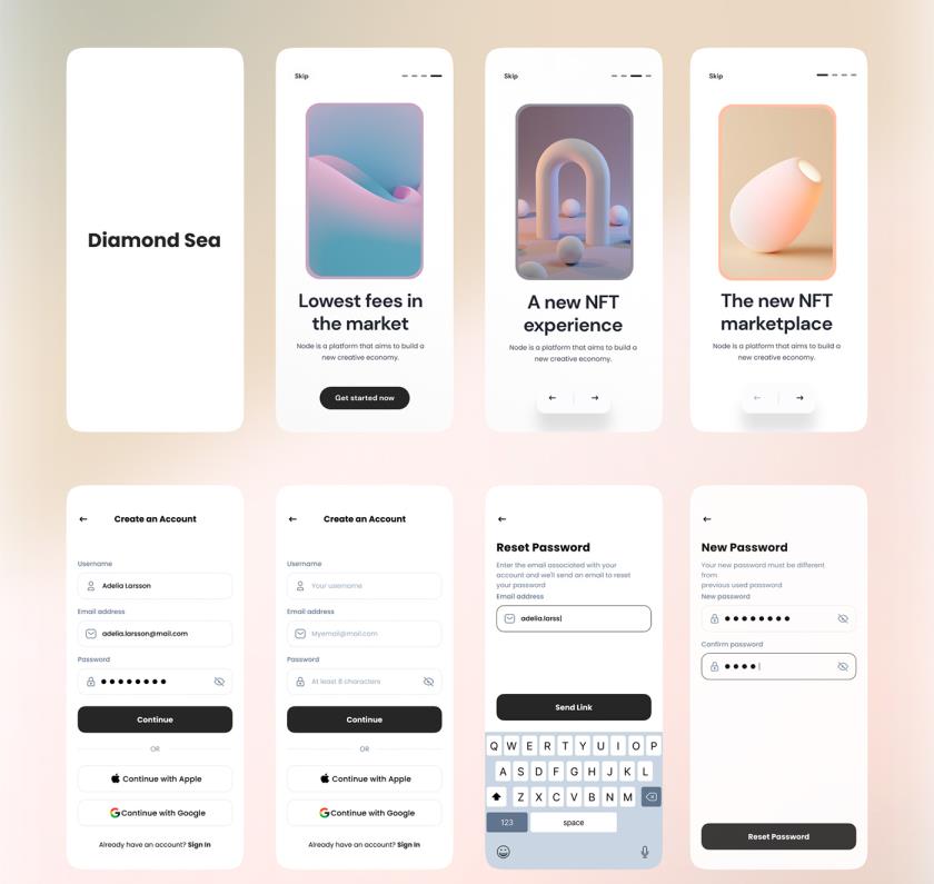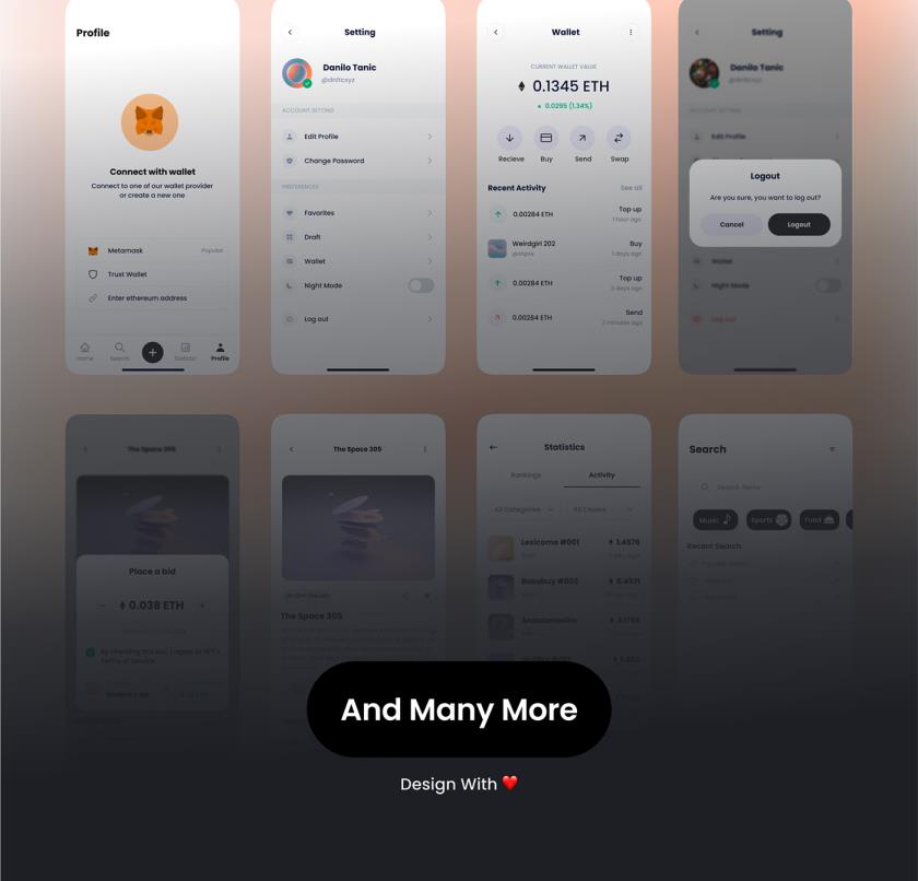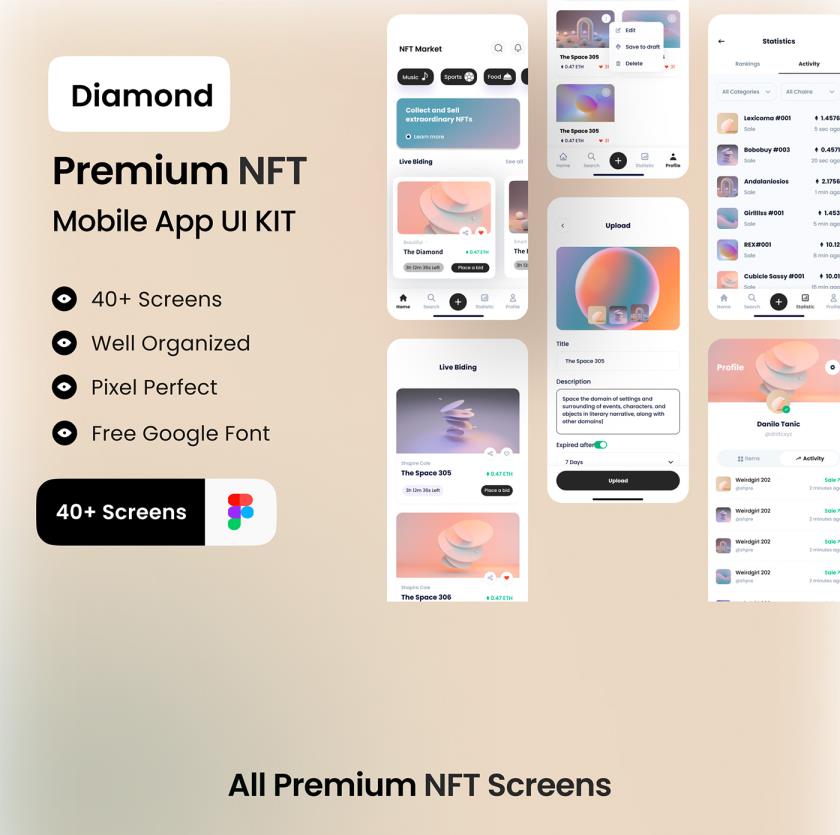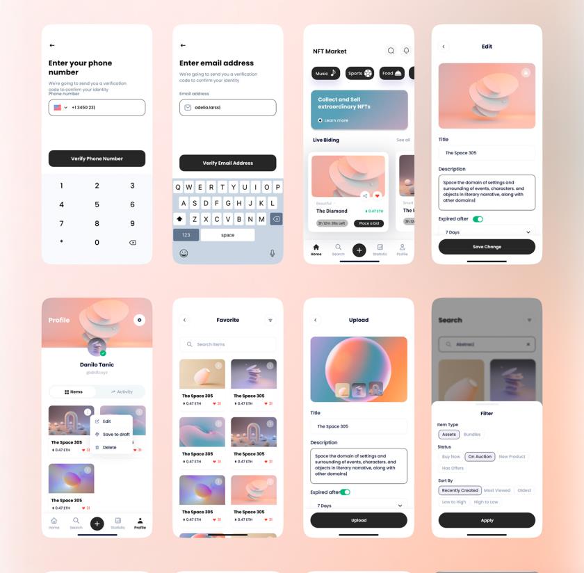 优质的 NFT 市场应用程序 UI 套件,具有40多个高质量屏幕,Figma格式