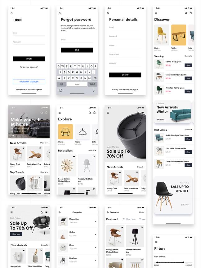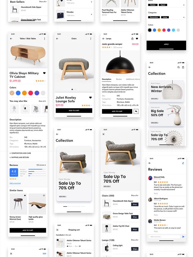 36页简约家具APP设计UI素材sketch,xd,figma格式