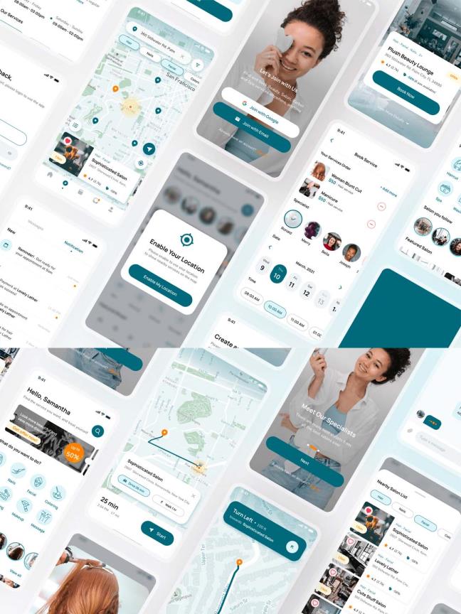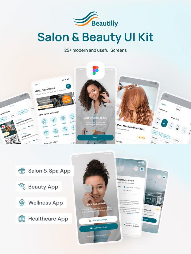 沙龙和美容 UI 设计套件figma源文件,超过25个屏幕50多个组件