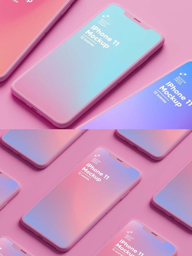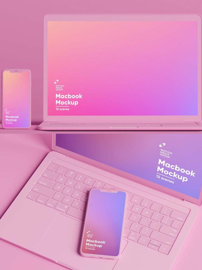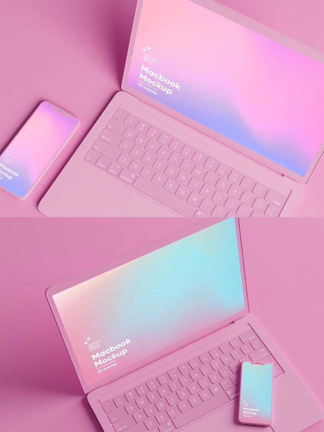 粉色迷幻风多角度iPhone和MacBook苹果设备样机mockup psd源文件下载