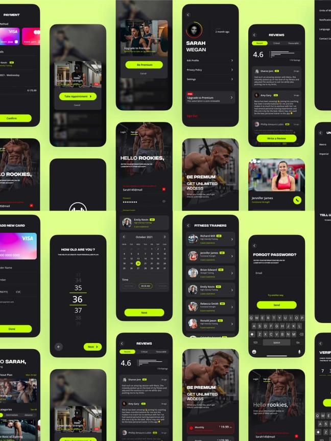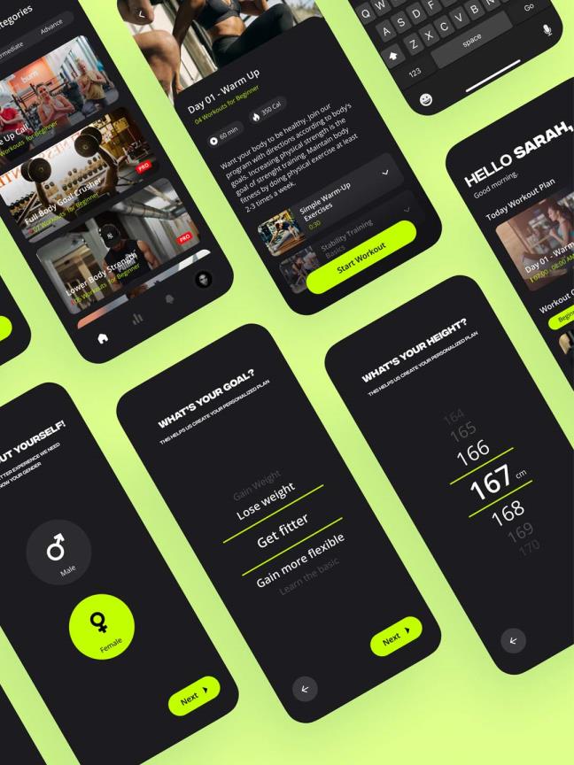 20页时尚健身APP应用ui模板包含 Figma、Adobe XD 和 Sketch 文件