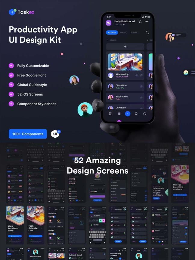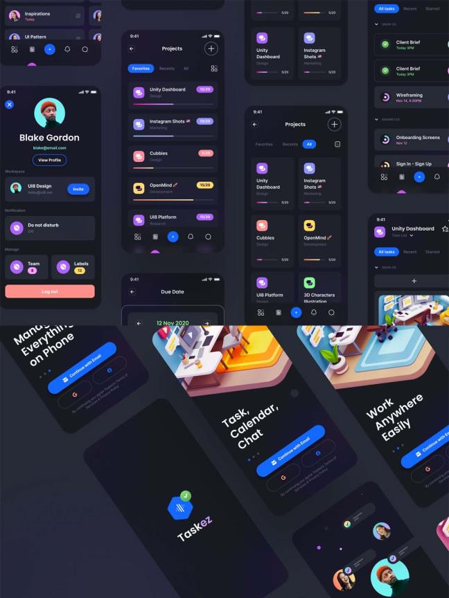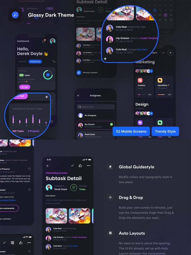 52页暗色系协同办公app UI kit套装源文件figma下载