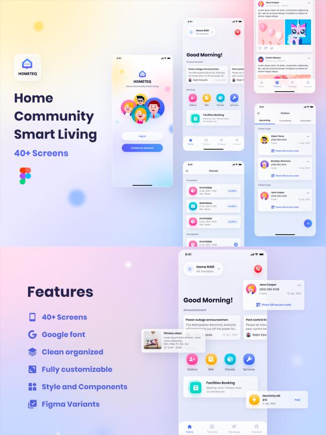 40页家居社区,智慧生活app UI资源素材figma源文件 2025-02-11 figma 概述 HOMETEQ 是一款现代、干净、时尚的 UI 套件,用于智能居民管理。这些组件由样式、自动布局和 Figma 变体组成,这些变体很容易定制。 页面包括:主页、访客、账单、包裹、服务、设施预订、社交订阅、创建活动和帖子、聊天、通知、帐户、设置、注册和登录 重点 40 多个精心制作的页面 完全可定制和可调整大小 组织良好的图层 免费的谷歌字体 自动布局和 Figma 变体 时尚设计 阅读全文 资源下载下载价格1.8 素材币VIP免费升级VIP立即购买