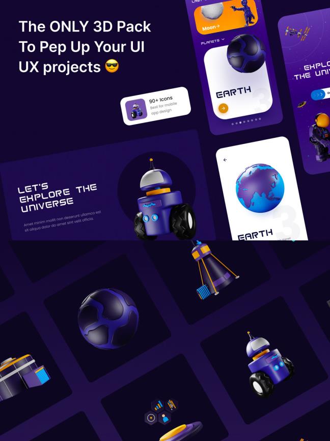 Cosmic 3D – Space Station 3D 插图与 40 多个 3D 高质量 PNG 渲染文件和 12 多个 3D 对象以及 Blender 源文件重合在一起。Cosmic 3D 是好的 3D 图标包之一。