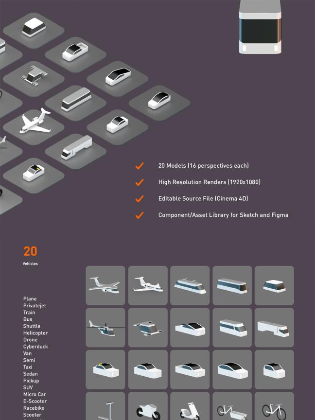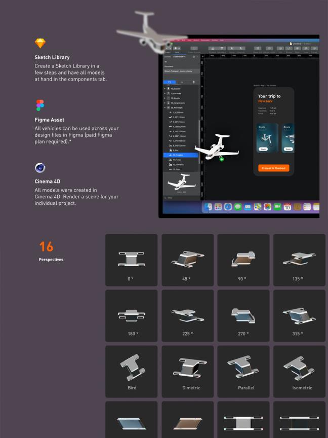 一套3D交通工具C4D源文件由5个类别的20辆车组成超级完善 设计资源 2025-02-09 3D插画 概述 运输工具包由 5 类 20 辆车组成: 飞机、客车、公共交通工具、两轮车和半轮车。 运输工具包适用于: – 草图库– Figma 资产库(资产功能需要付费计划)– Cinema 4D– 您的任何应用程序、印刷品和网站(包括 PNG 文件) 安装指南位于下载文件夹 (PDF) 中。 强调 草图库 Figma 资源库 包括源文件。 每辆车有 16 个视角覆盖您的所有场景。 总共 320 个 3d 模型 为您的移动项目带来独特的触感。 阅读全文 资源下载下载价格1.2 素材币VIP免费升级VIP立即购买