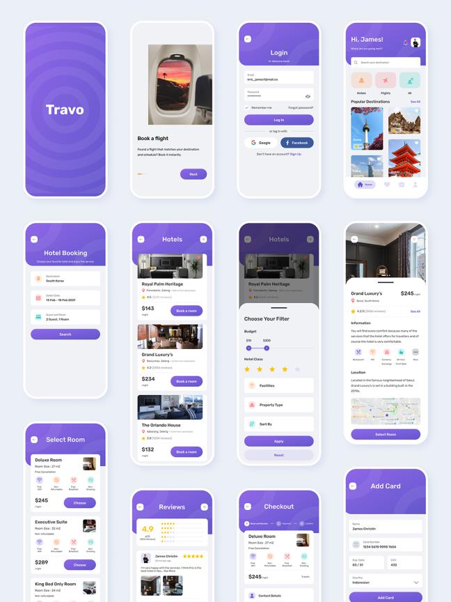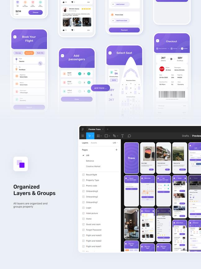 43页旅行,航班和酒店APP设计Figma、Sketch 、 XD、studio格式