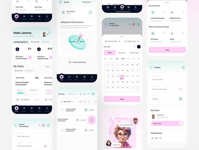 70页项目管理“极简风 + 轻量插画” 风APP界面设计figma源文件