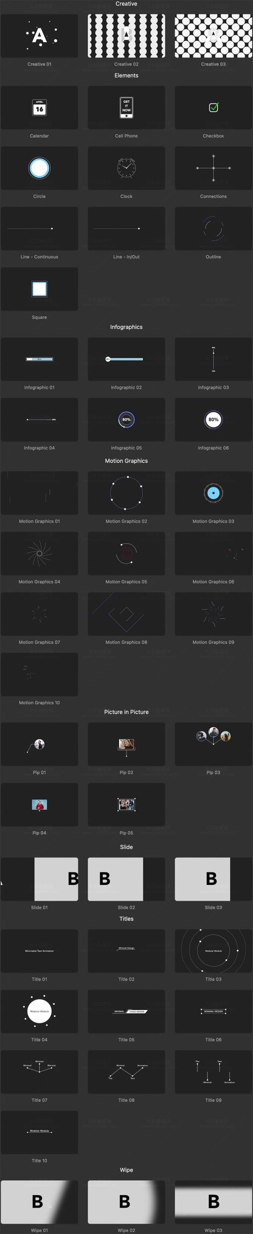 这些动画可以自由组合,搭配出更多创意动画。安装后在字幕类/转场类中找到插件使用。