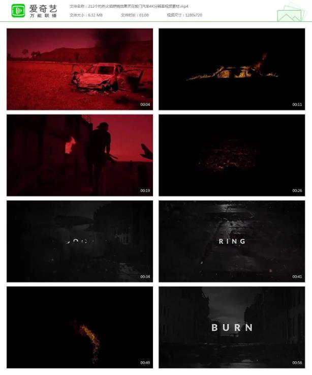 【素材介绍】共212个由RED摄像机拍摄的火焰燃烧4K视频素材,可用于用于特效合成;分辨率:3840×2160,4K高清;无透明通道(可修改混合模式去黑底透明叠加使用)。还提供了在 AE PR FCPX 里如何使用的视频教程,素材信息:适用系统:Windows 和 Mac OSX 系统素材分辨率:3840×2160,4K高清帧速率:23.976 帧fps素材格式:.MP4 视频( AVC 编码)素材数量:212个视频素材+1个使用视频教程通道信息:无Alpha透明通道(可混合模式去黑底透明叠加)素材大小:约 15.2G(解压后15.2G)传送格式:.zip 压缩包文件