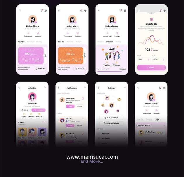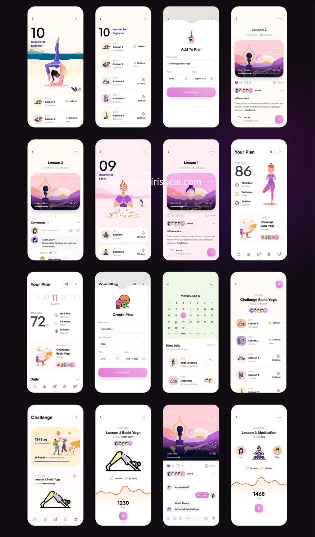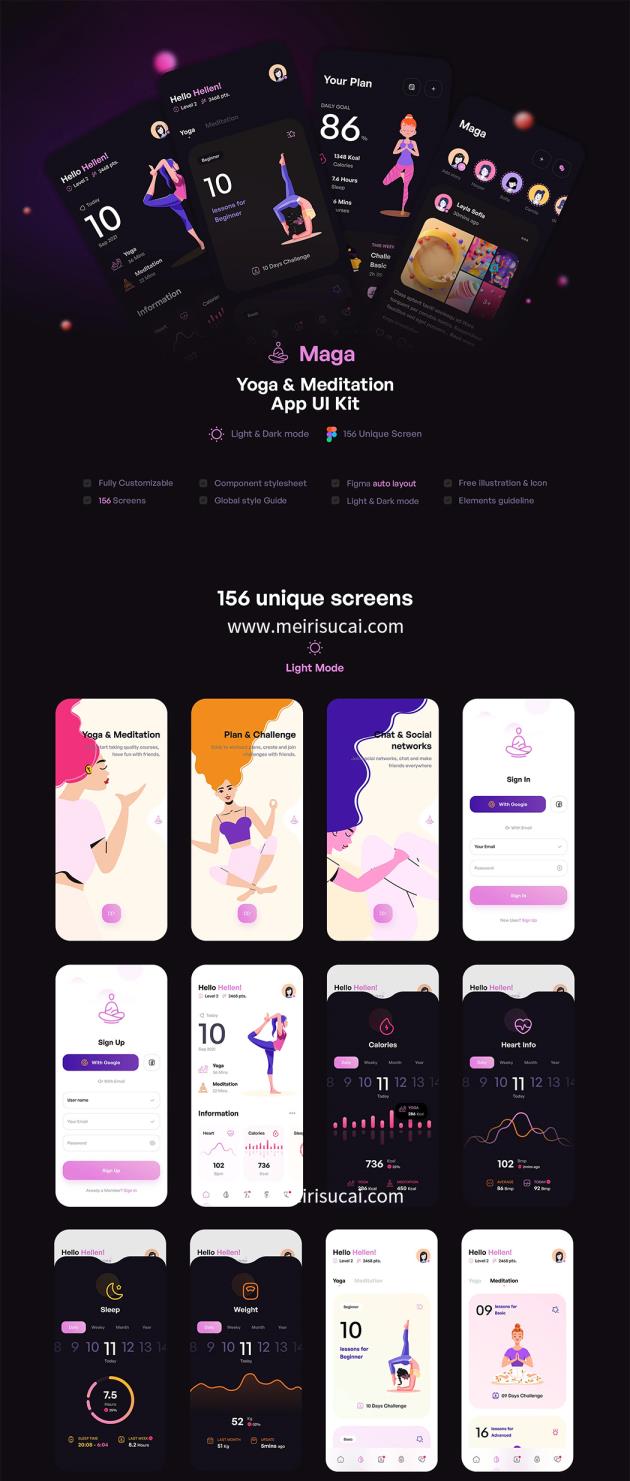 156页时尚的明暗模式瑜伽和冥想UI工具包figma源文件