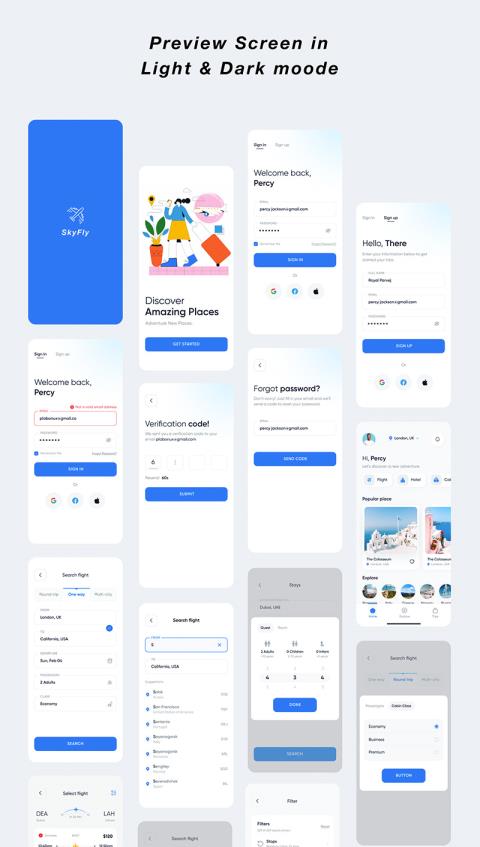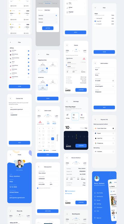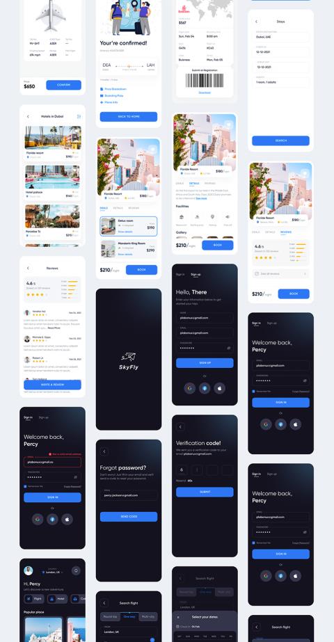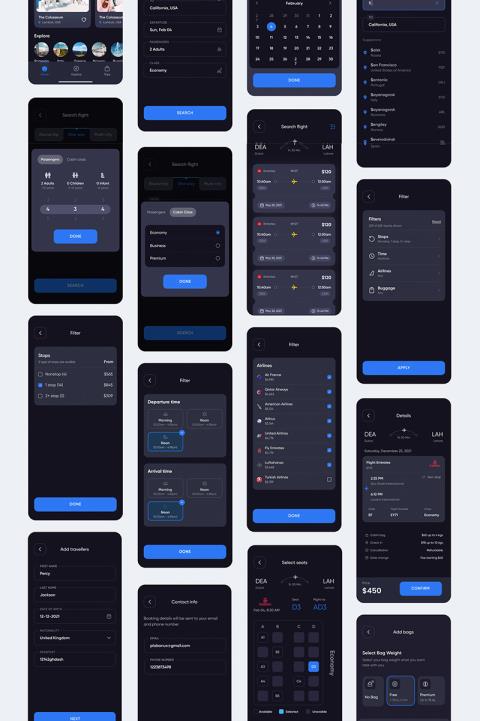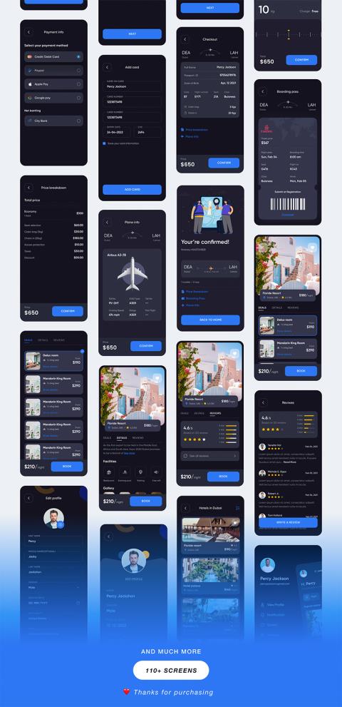 110页明暗模式航班预订App应用程序UI套件figma源文件